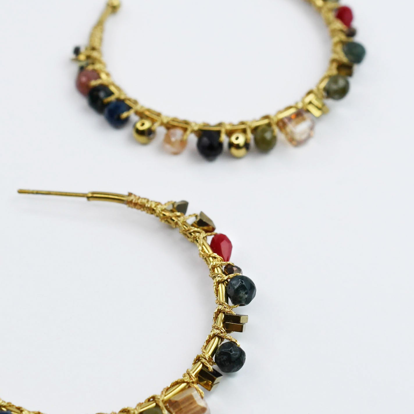 - Designed with a playful mix of multicolored beads and gold accents, these hoops bring a touch of boho chic energy to any outfit.
