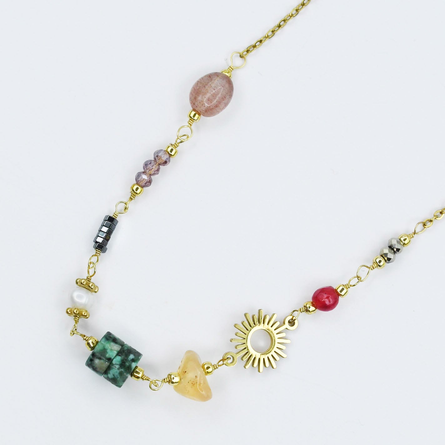 - Designed with a joyful mix of colorful beads, unique gemstones, and a radiant golden sun charm. This necklace is full of personality and charm.