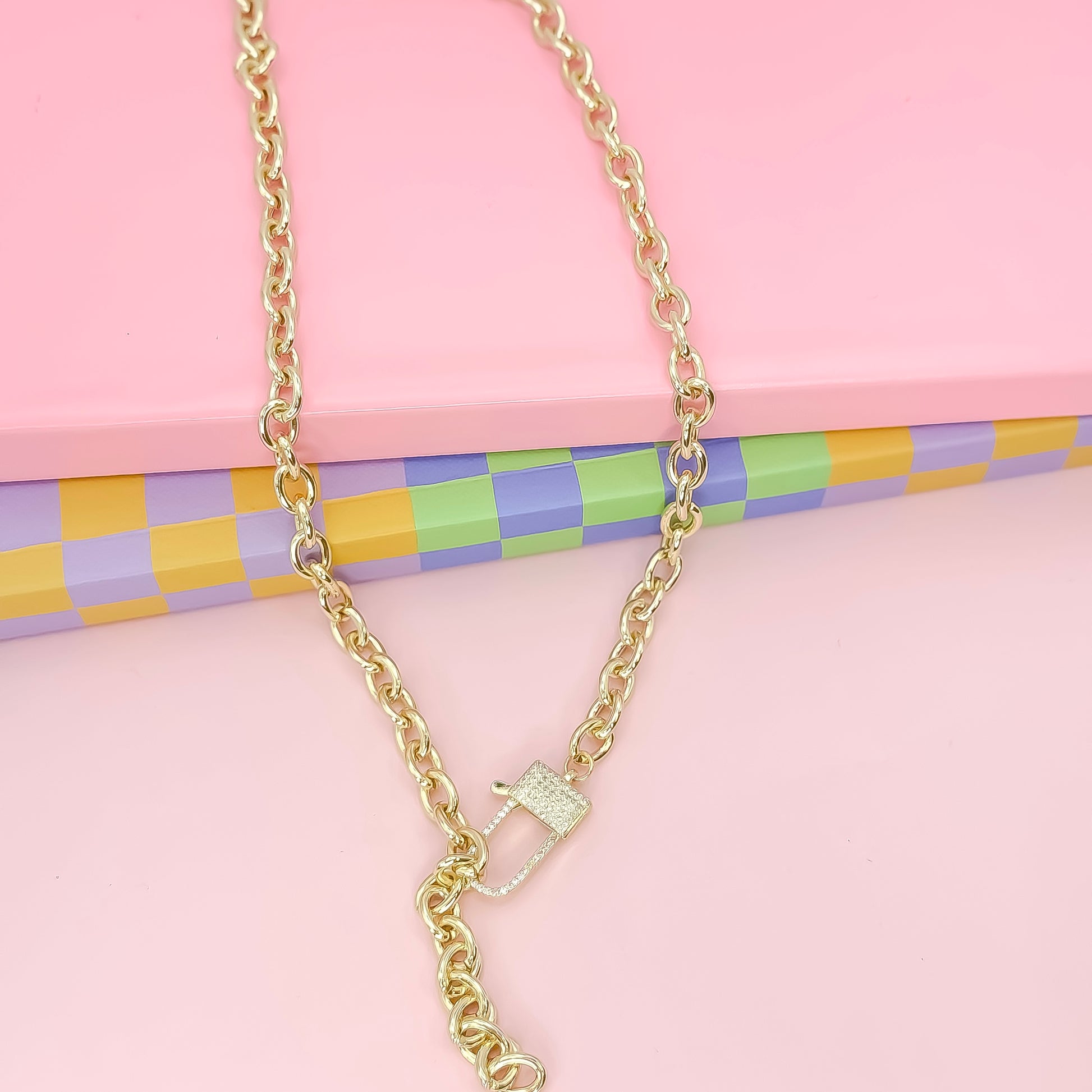 Make a statement with our Bold Moves Chain Necklace. Featuring chunky gold links and a sparkly pavé-studded lock clasp, this piece brings edgy elegance with a playful twist. It’s perfect for layering or rocking solo when you want to turn heads and own the spotlight.