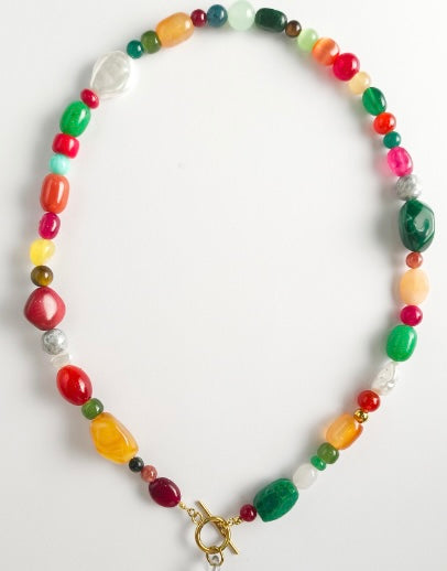 - Bursting with playful color! This necklace features a joyful mix of vibrant, irregular beads in every shade of the rainbow, accented with a bold gold toggle clasp.