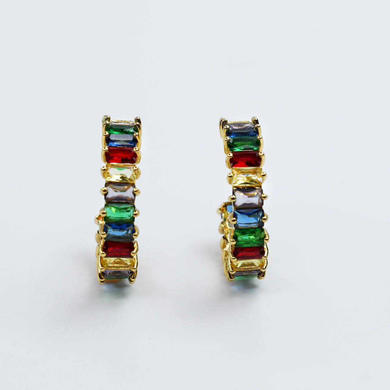 - Featuring stunning lineup of multi colored stones set in gleaming gold. These hoops are designed to dazzle from every angle.