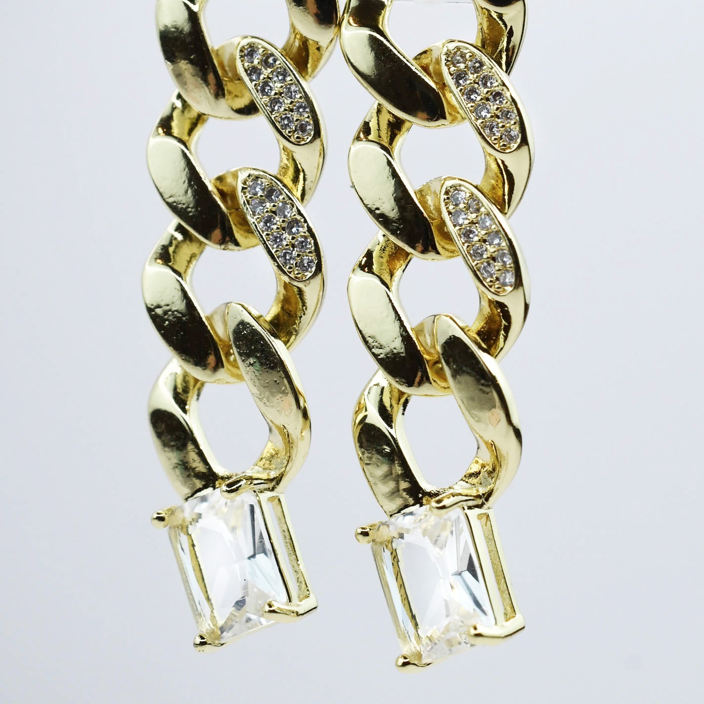- Crafted with chunky gold chain links, pavé sparkle accents, and finished with a radiant clear crystal, these earrings exude modern glamour.