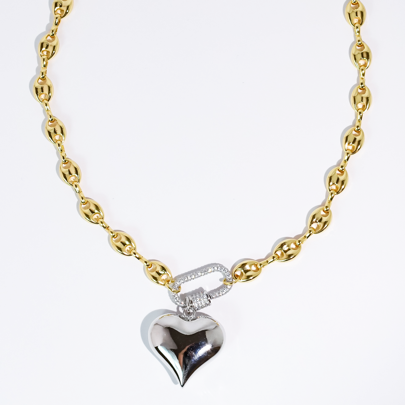 • A bold two-tone necklace featuring a gold statement chain and a shiny silver heart pendant—perfect for mixing metals with a touch of glam.