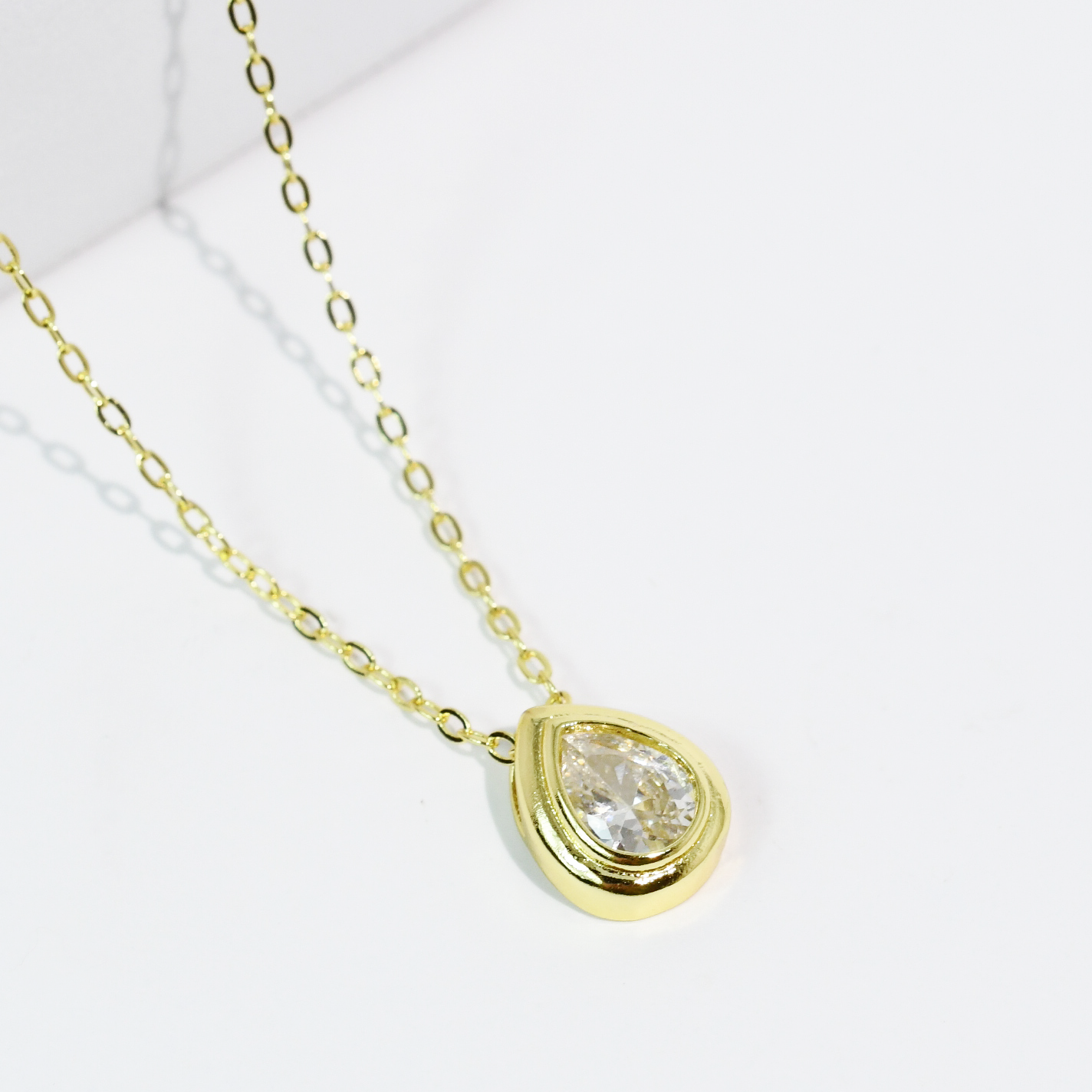 - This stunning necklace features a modern paperclip style gold chain paired with a radiant bezel set crystal that catches the light from every angels. It's bold yet feminine classy yet playful, the perfect everyday luxe piece.