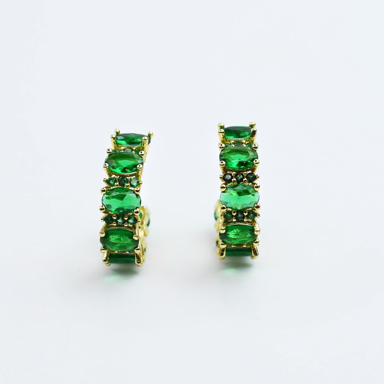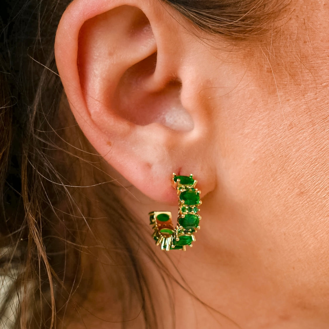 - Crafted radiant gold plating and set with vibrant emerald green stones, these hoops bring just the right balance of bold color and classic sophistication.