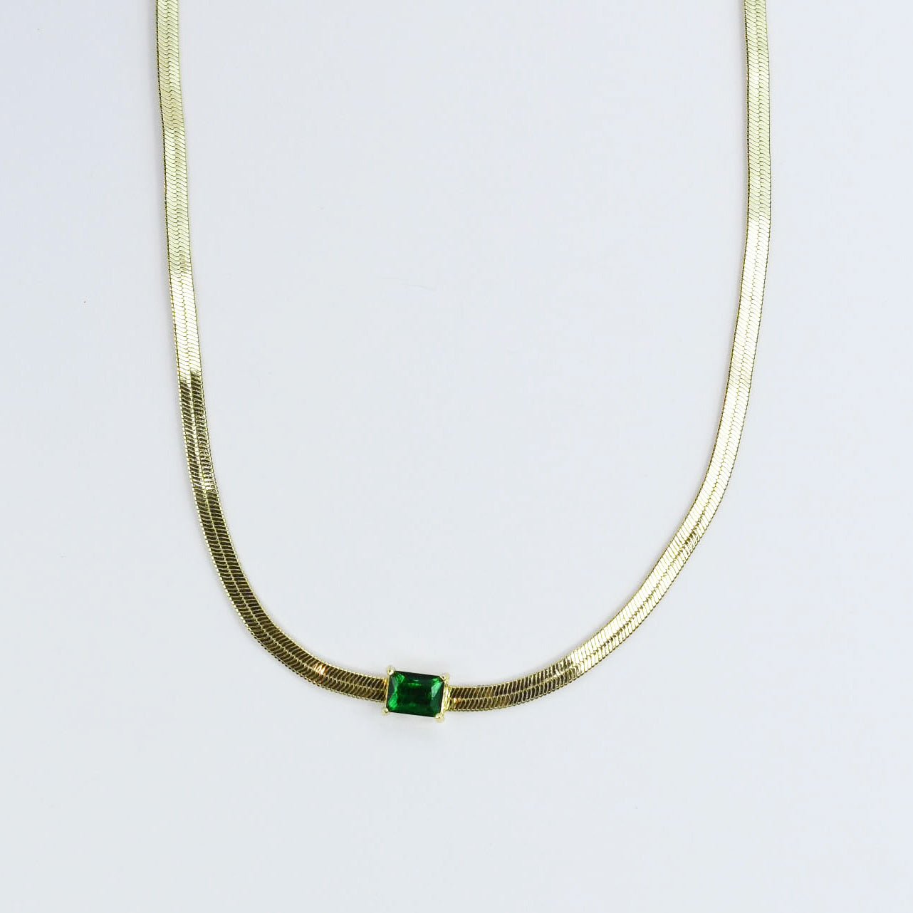 - A sleek gold snake chain is accented with a single brilliant stone, adding just the right pop of color and sophistication.