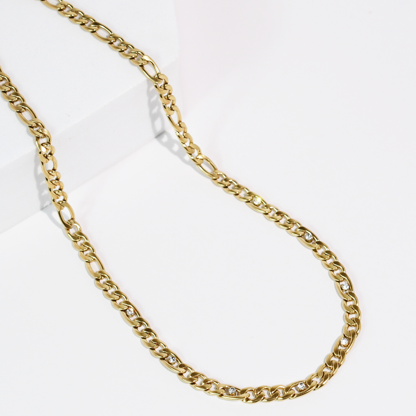 - Classic with a touch of sparkle ✨ This statement gold-tone chain necklace features a bold curb chain design accented with subtle crystal details woven throughout for an elevated, modern look. The polished finish gives it that effortless luxury feel while still being easy to style day or night.
