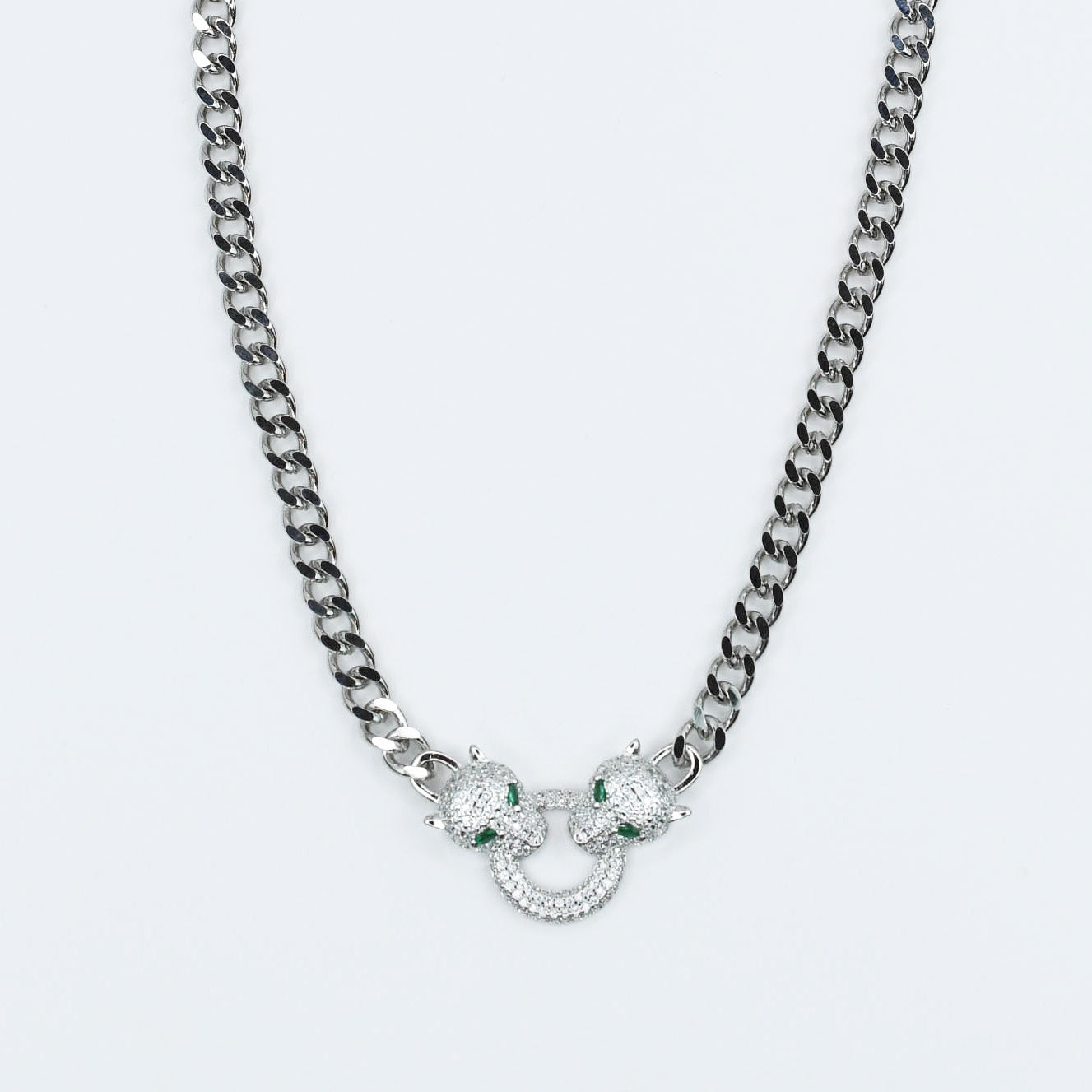- Featuring bold silver link chain anchored by two sparkling panther heads with striking green eyes, this necklace embodies confidence and elegance.