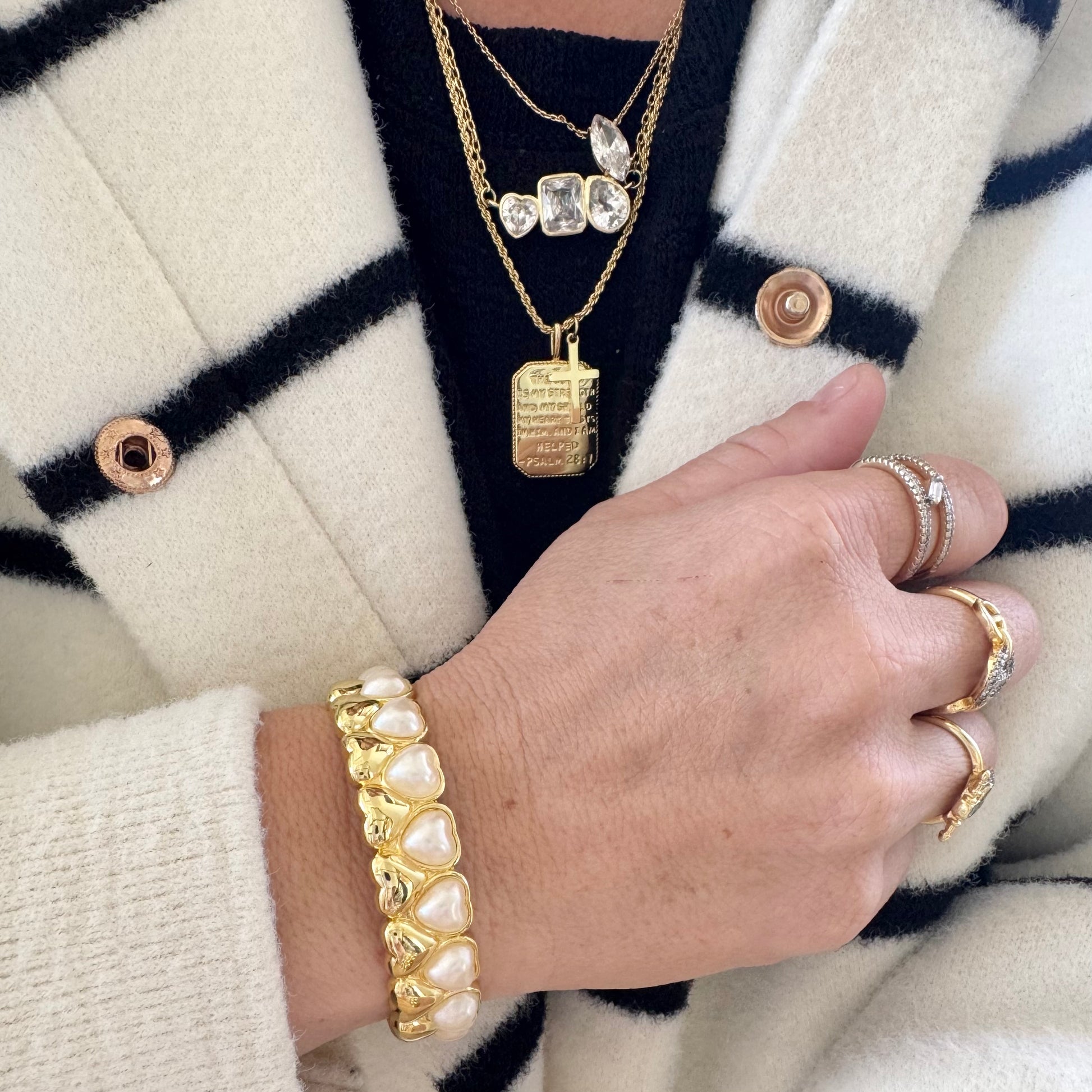- Slip on sparkle and sentiment with this delightful Pearl Heart Cuff. Lustrous pearls intertwine with charming heart motifs along a graceful band, creating a piece that radiates joy and romance. This playful accessory brings a dash of personality to your wrist, whether you're celebrating love or simply embracing a bit of everyday magic. A perfect companion for those who adore whimsical, heartfelt style.