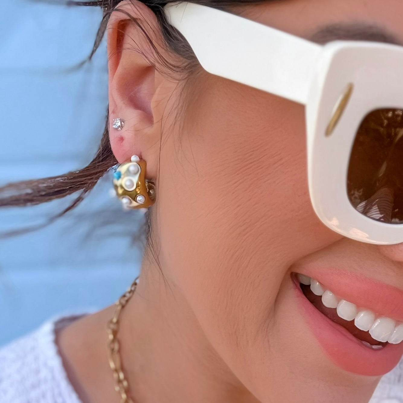 - Playful sparkle with a modern twist. Features a bold gold tone dome design accented with delicate pearl details and a pop of soft blue stone for a fresh, eye catching look.