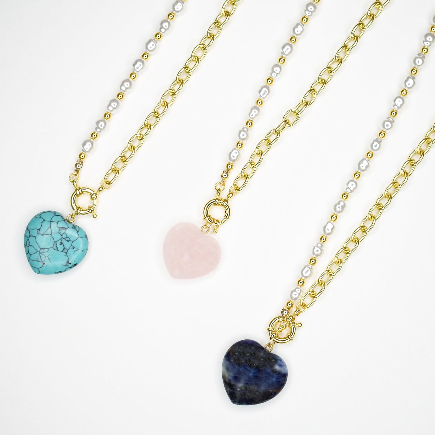 - Fall in love with timeless elegance. Each necklace features a radiant heart shaped gemstone framed on a luxe gold link and pearl beaded chain.