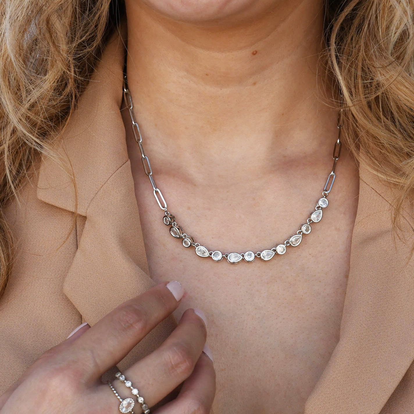 - Featuring a dainty silver chain with luminous pearl and round-cut crystals, this piece blends classic elegance with modern charm.