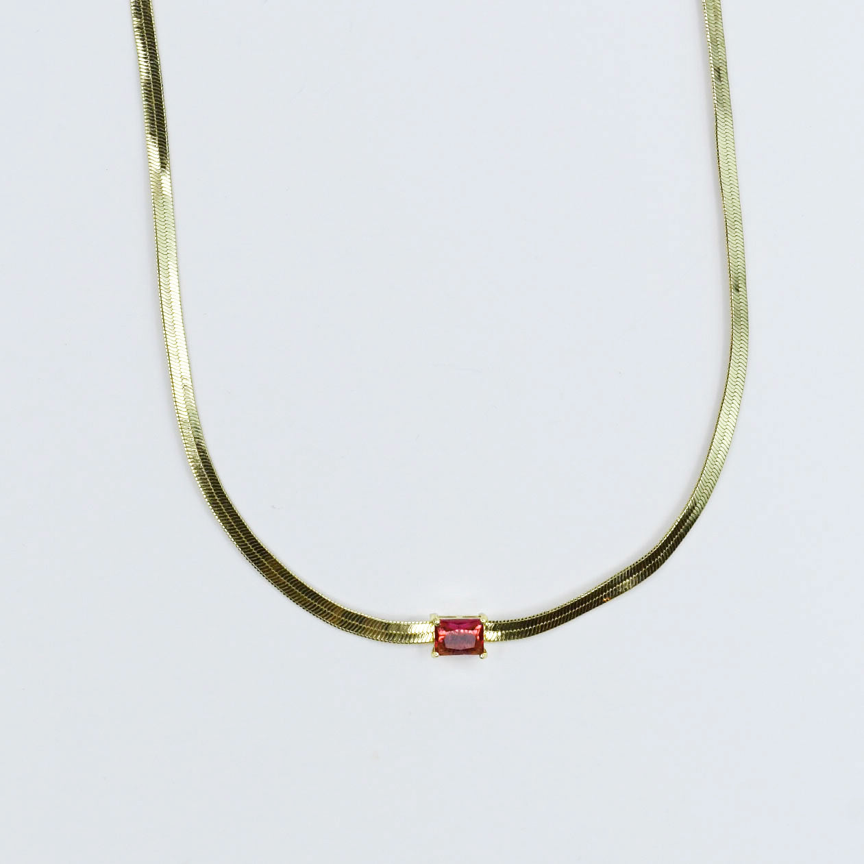- Features a polished gold snake chain accented with a single ruby stone. Its minimalist design makes it the perfect layering piece Roa refined solo statement.
