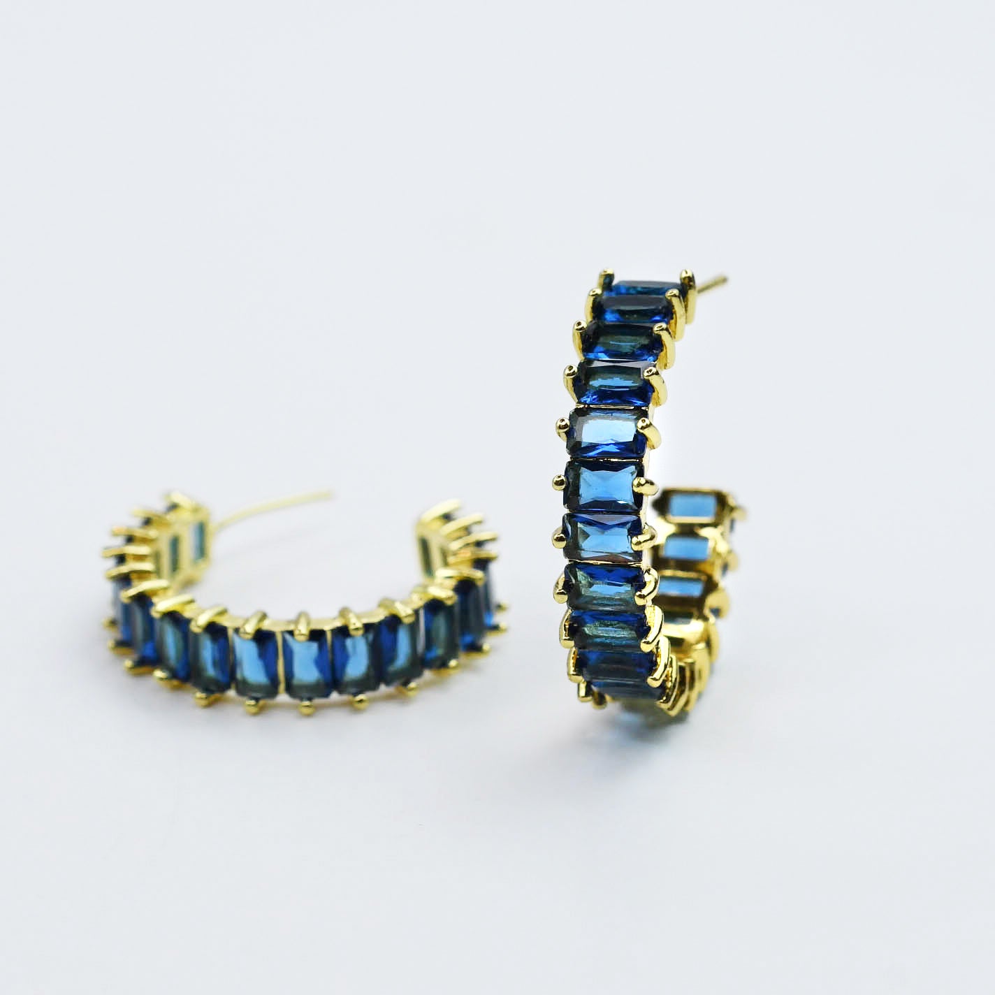- Designed with sapphire blue stones set in luminous gold plating, these hoops capture the elegance of twilight skies.