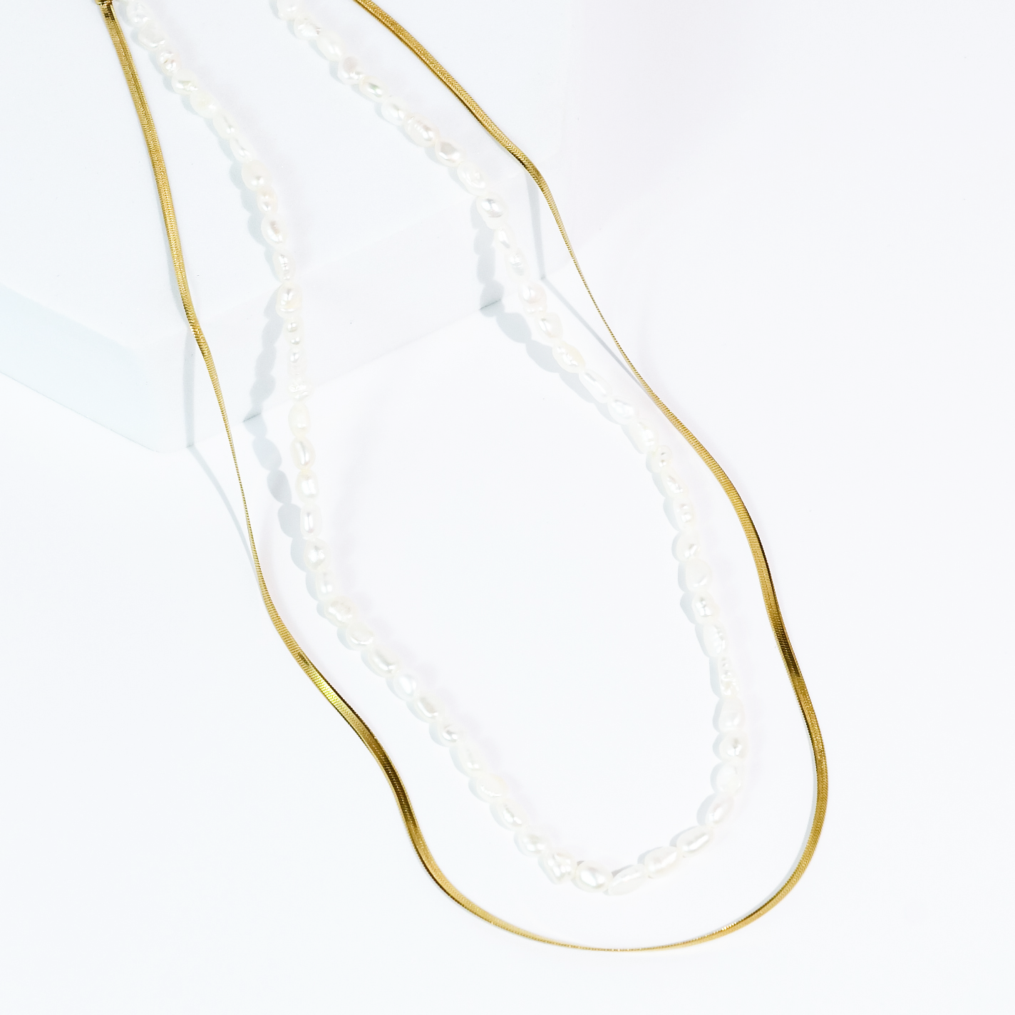 - Meet the set that makes every outfit feel instantly elevated. This dreamy duo pairs a sleek, high shine gold herringbone chain with a delicate strand of organic freshwater style pearls, creating the perfect balance of modern glam and timeless femininity.