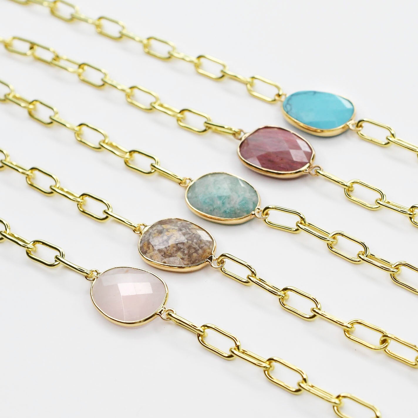 - Each piece features a stunning natural gemstone, from soft rose quartz to vibrant turquoise.