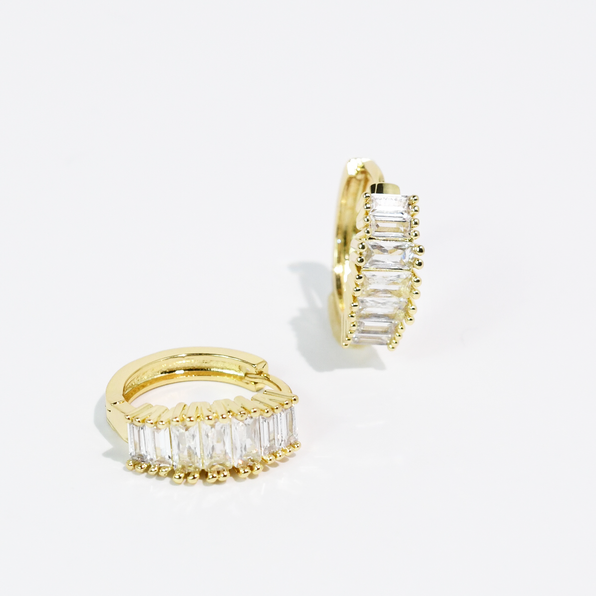- Featuring a row of brilliant baguette crystals set in polished gold. These huge earrings deliver a refined, classic look you'll never get tired.