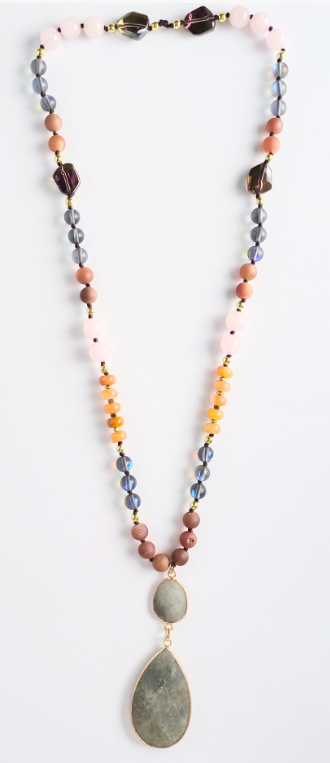 - Blends warm, radiant hues of peach, amber, and blush pink with deep earthy tones and touches of gold. Finished with a striking double stone pendant in muted gray green.