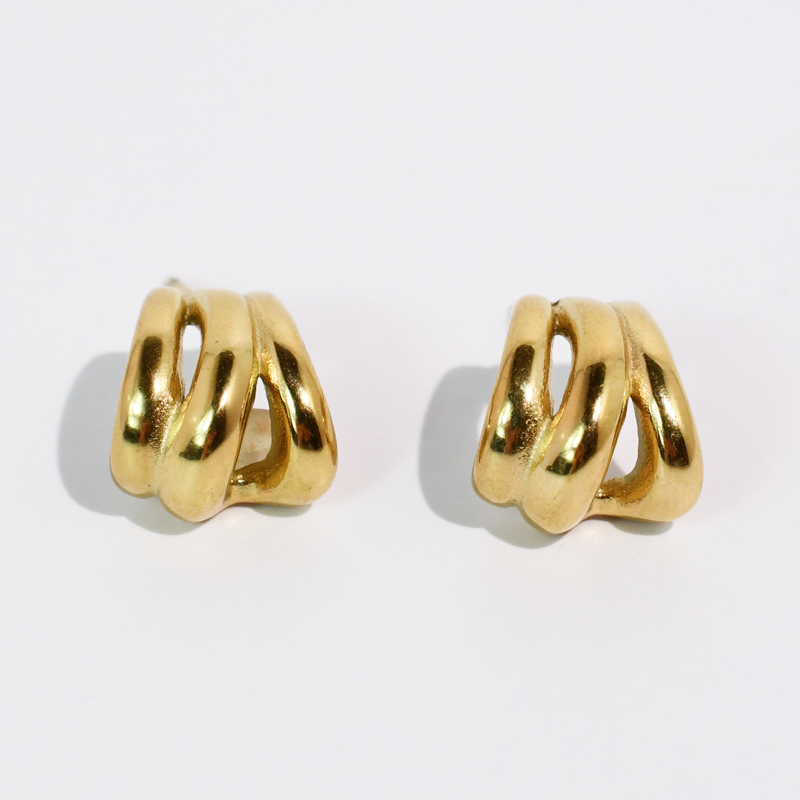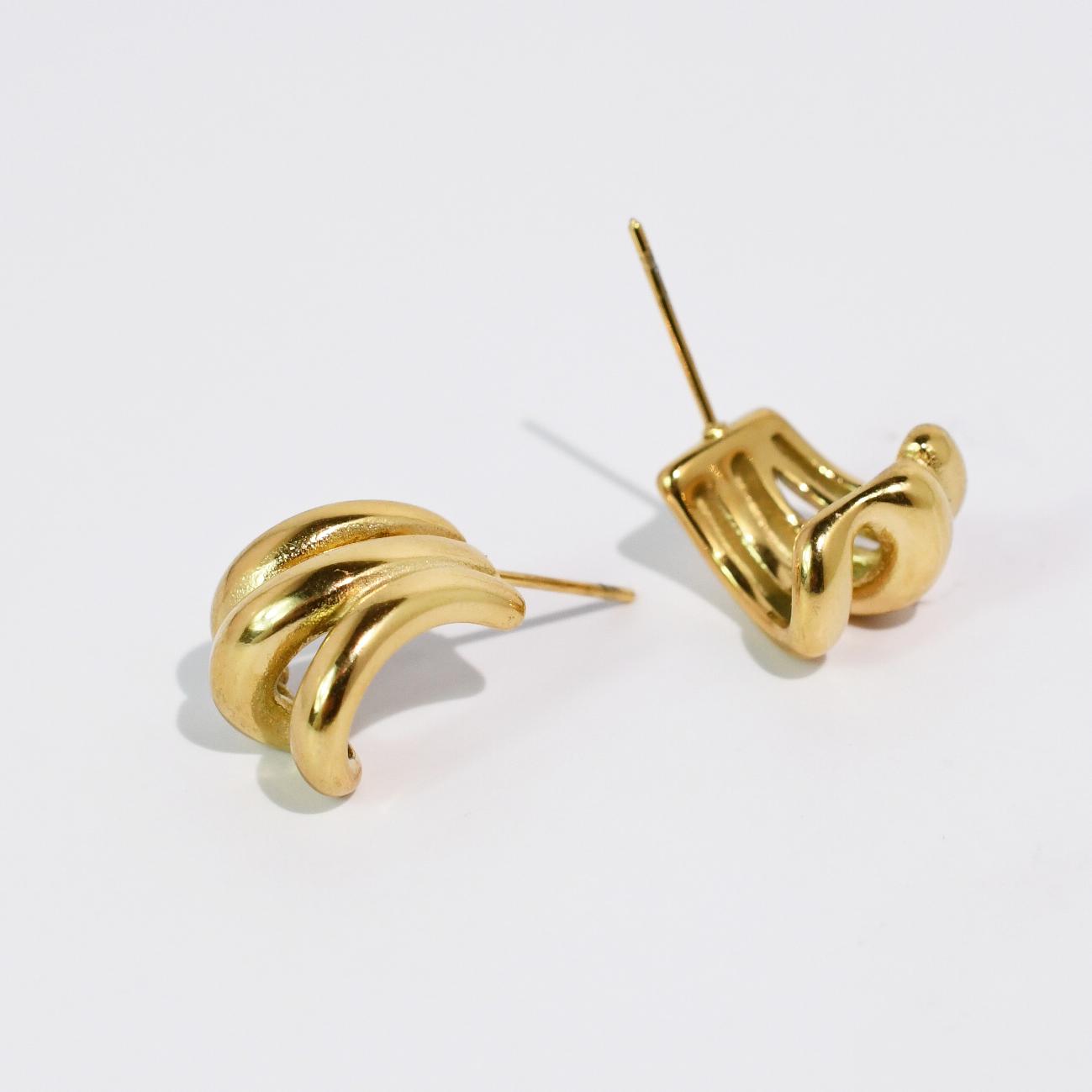 - These bold wave gold stud earrings feature a sculptural, layered seeding with a high polish gold finish.