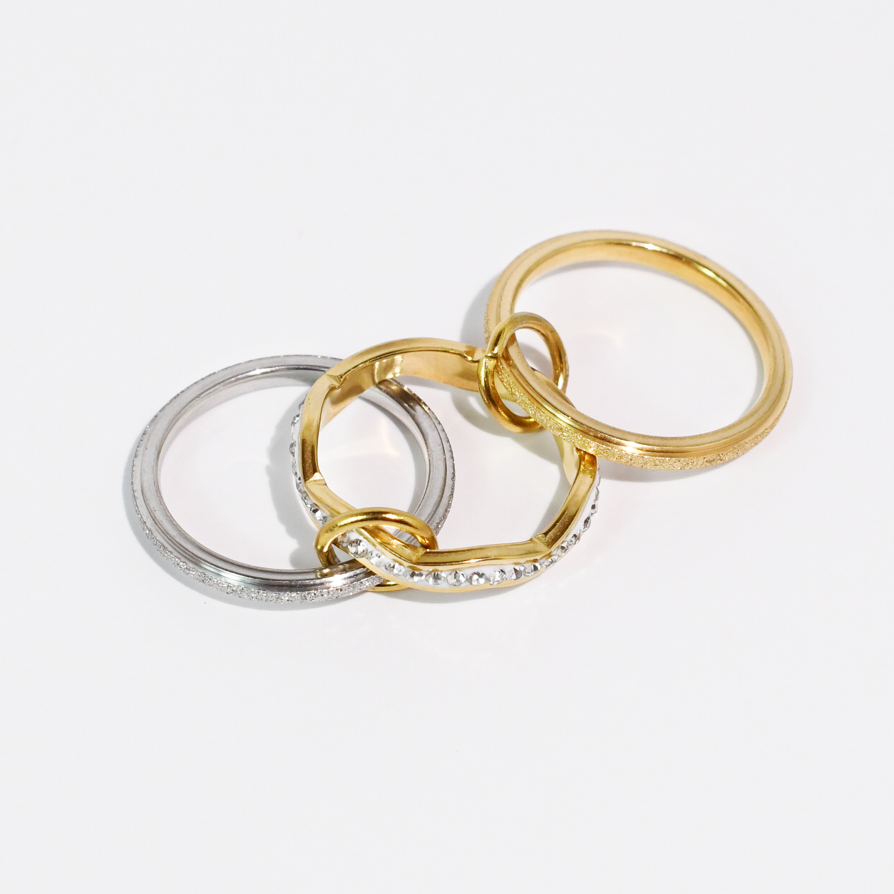 A layered ring stack featuring mixed metals and crystal accents for everyday sparkle.